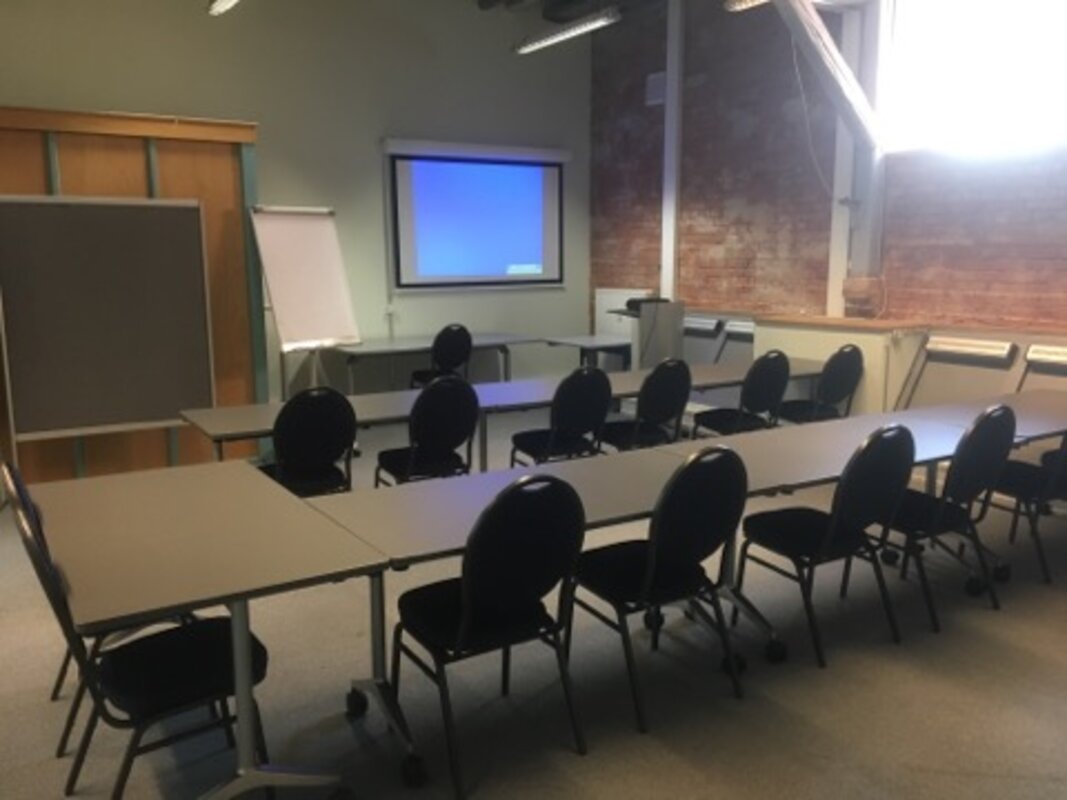 2 Stellwände, 10 Tische bis zu 24 Personen oder mehr bei beidseitiger Bestuhlung (z. Bsp. U-Form) oder 30 Stühle mit Reihenbestuhlung ohne Tische, Rednerpult, große Leinwand, Projektortische, Flipboardchart. Kein W-Lan.